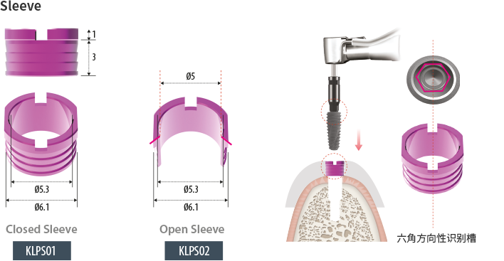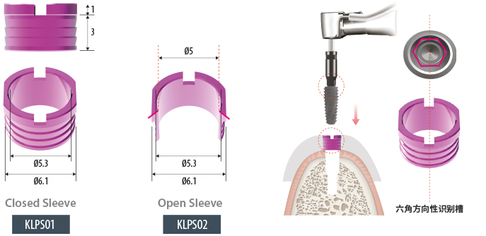 - 植入植体时,种植体接合器的方向与套筒槽的方向相匹配,同时使临时基台的六角方向一致