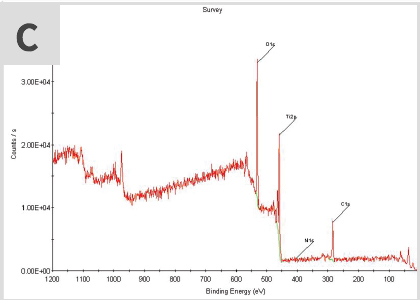 - 每个表面元素的定量分析发现所有产品中30%碳、47%氧、16%钛和4%硅。