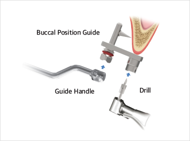- 将Guide Handle连接到Buccal Position Guide,然后固定于种植体植入位置,在Sleeve内部洞里插入Guide Drill并进行钻孔。