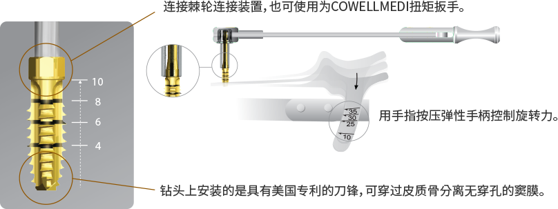 - 以Ø3.2扩张器代替点钻使用时,可轻松地进行手术。