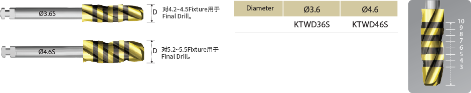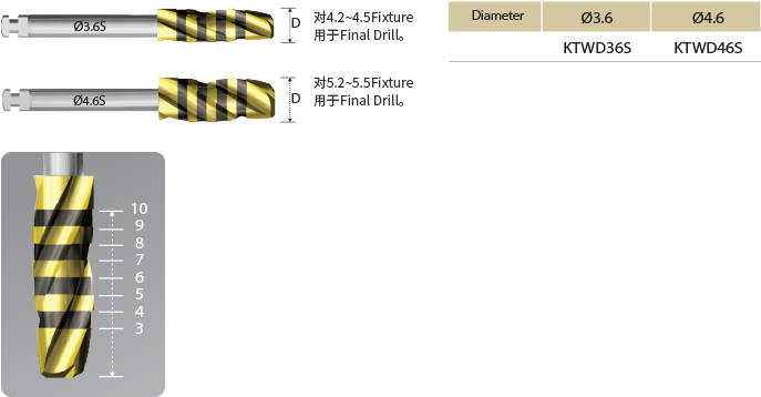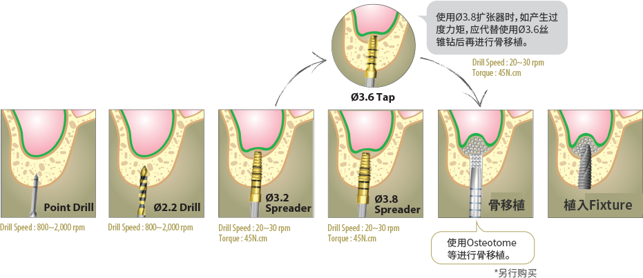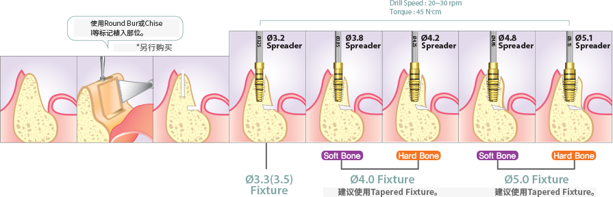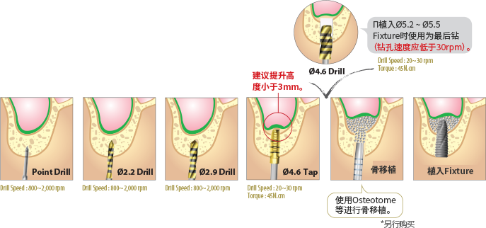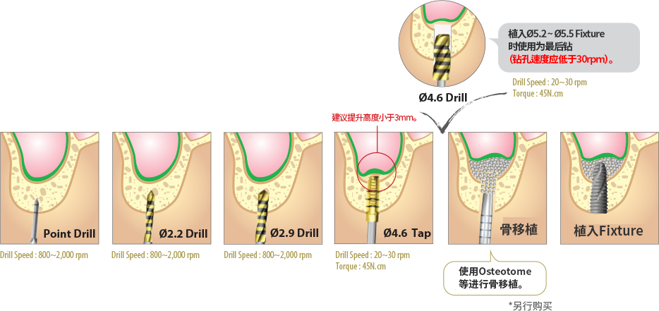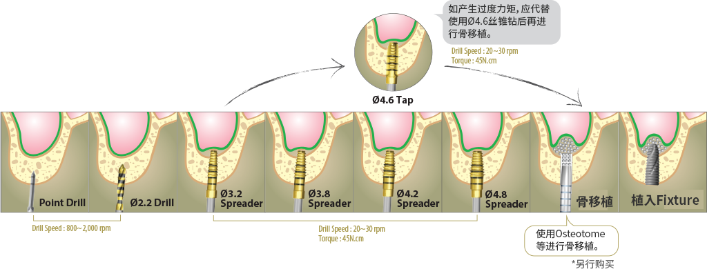 - 骨质为D2时,植入Fixture前使用最后钻,注意不要过度施压于周边齿槽骨。