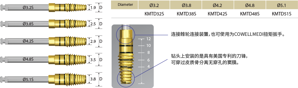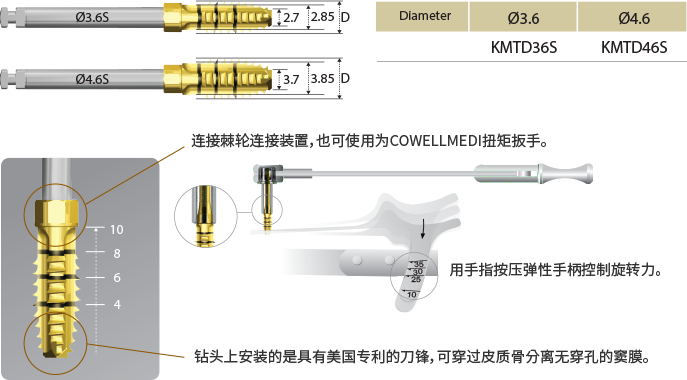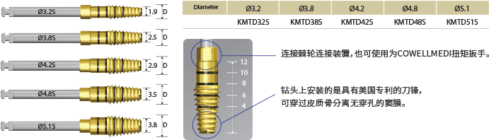 - 螺旋钻用于硬骨(骨质2以上)的最后钻,或用于消除螺纹,以方便植骨。