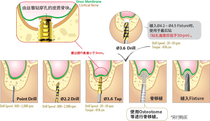 - 提升上颌窦时,建议采用一起使用上颌窦提升钻和扩张钻的手术方式。