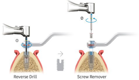 - ※ 以最大的扭矩力也不可移除Fixture时,Fixture Remover和F/R Screw分离,用Round Bur移除Fixture周边的骨,然后再次进行移除Fixture.