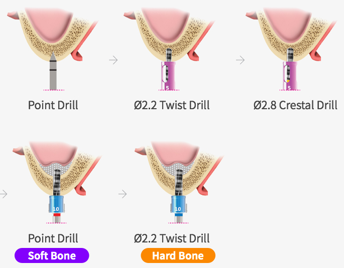 - ※ 使用比植体短一阶段的钻 (Ex. 10mm implant, 8 ~ 9mm Drill)