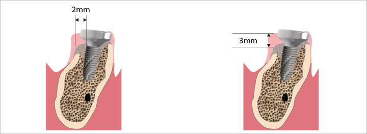 为防止种植体周围炎等并发症并成功进行种植体手术,应在理想的位置植入Fixture。为颊侧牙龈再生,Fixture的位置应与颊侧骨至少维持2mm;为齿槽骨再生,还需要让Fixture的位置维持在下方至少3mm的距离,以保持牙龈高度。