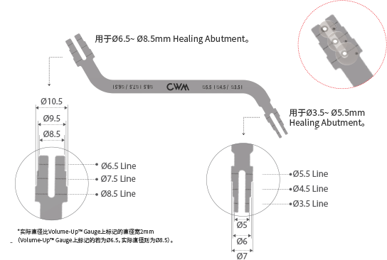 将Volume Up™ Gauge置于种植体植入部位上,确认愈合基台的直径。