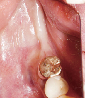 4周后,萎缩的颊牙槽骨和牙龈恢复到自然的形状和宽度,从而实现不仅可以防止食物侵入,还美观的义齿制作。