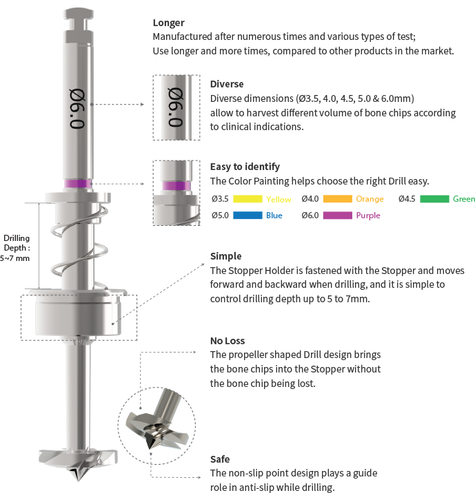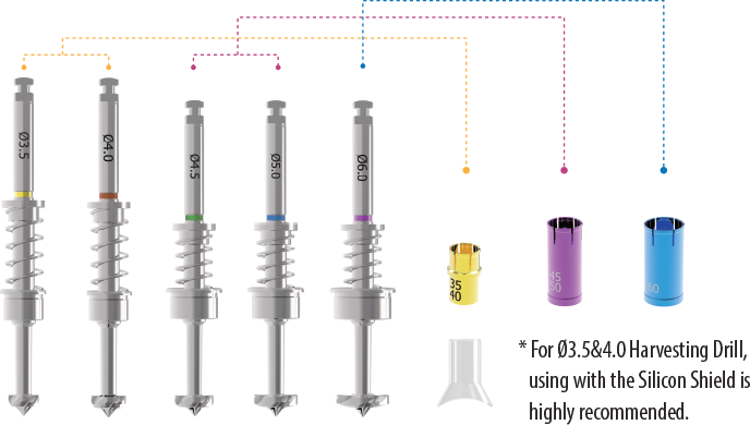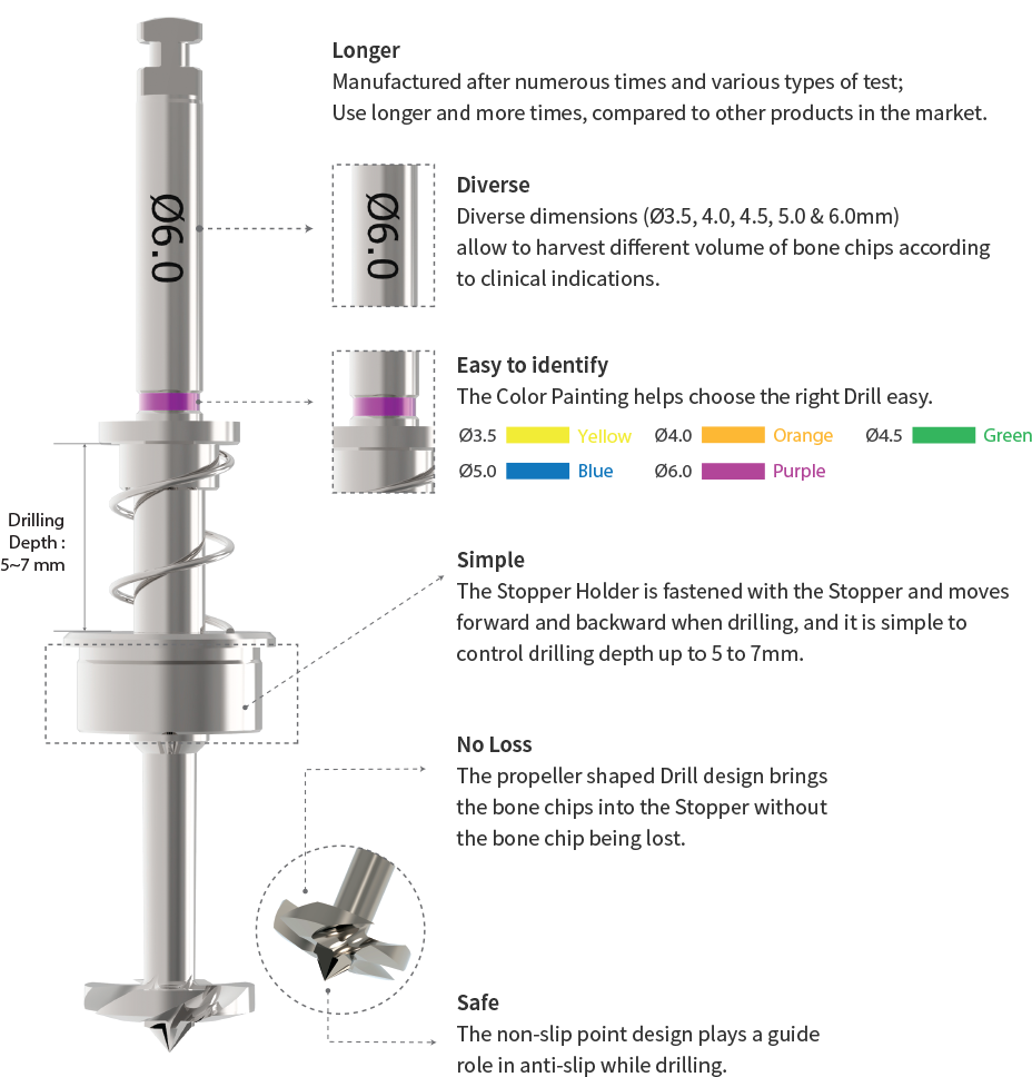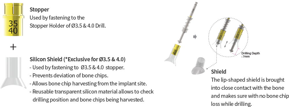 • * 2 Step Harvesting : Drilling to 7mm is recommended after transferring bone chips to bowl since the Stopper & Silicon Shield are fully filled with bone chips while 4mm drilling.