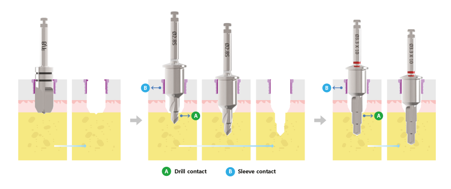 - Create the hole using the initial drill and insert the next drill into the hole made during the previous step and drill after achieving the drill and sleeve contact (A&B).