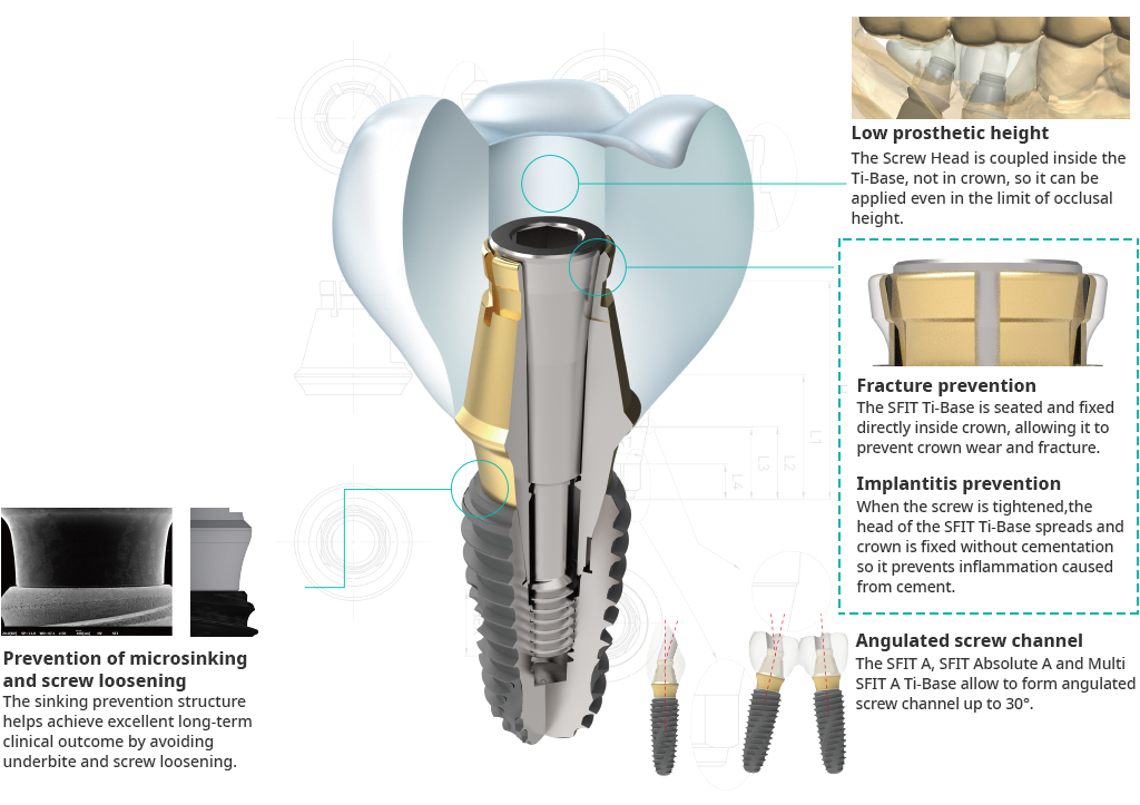 The HEAD of the SFIT Ti-Base Screw gives a force to the POST TOP of the SFIT Ti-Base to be SPREAD and FIT in the undercut of the inner side of the Crown When the SFIT Ti-Base Screw is tightened.