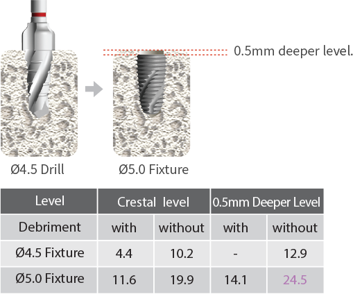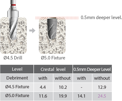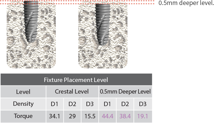 The 0.5mm deeper placement increases the initial torque force of fixture.