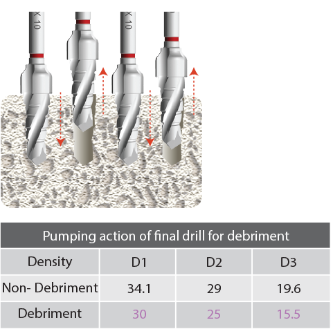 In dense bone, the debriment action decreases the high torque force.