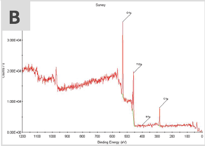 - Quantitative analysis of each surface element found 30% carbon, 47% oxygen, 16% titanium, and 4% silicon in all products.