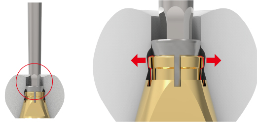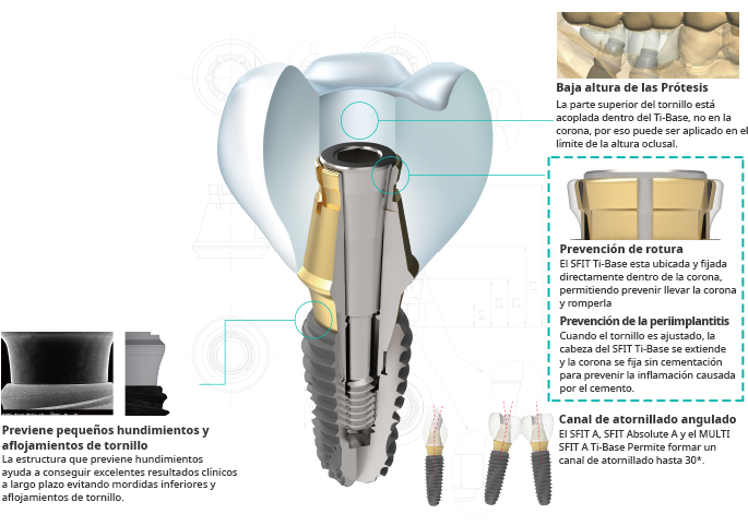 La parte superior del SFIT Ti-Base da fuerza a el POST TOP del SFIT Ti-Base para que se EXTIENDA y ENCAJE en el cortado inferior dentro del costado de la corona cuando el tornillo SFIT Ti Base es ajustado.