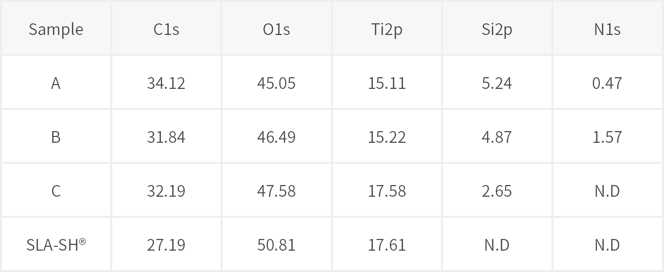 - For SLA-SH®, they only consisted of carbons(C1s), oxygen(O1s), and titanium(Ti2p).