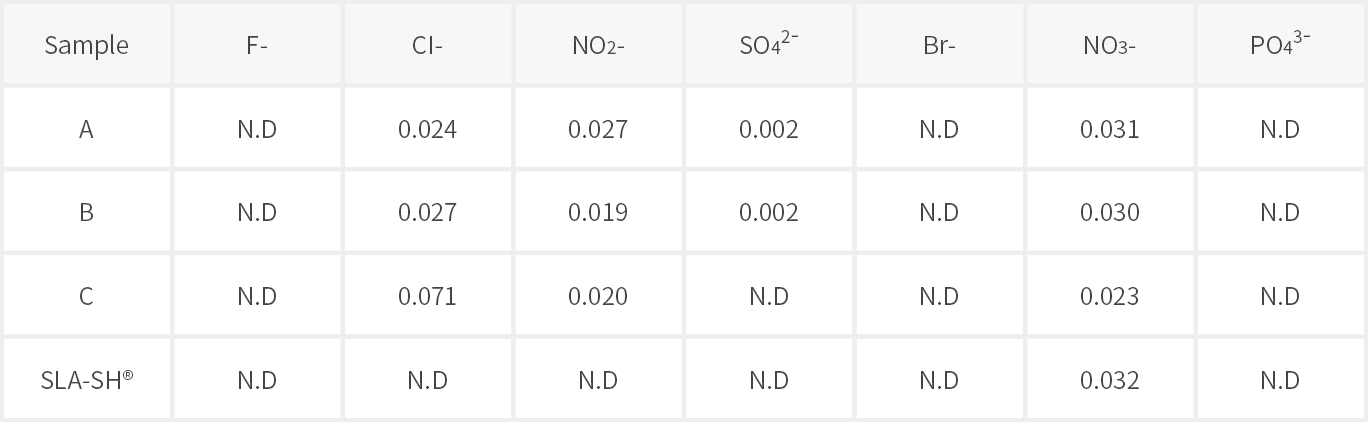 - For SLA-SH®, no other elements except for NO3- were detected. Alkali washing completely removed the SO42- and Cl- ions of sulfuric acid and hydrochloric acid, which are used for heated acid etching because they form water-soluble salts of Na2SO4 and NaCl.
