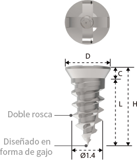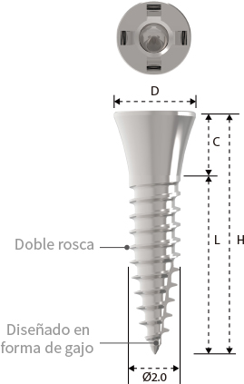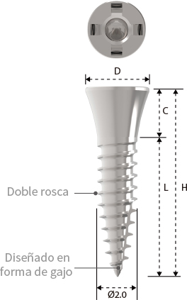 Permitiendo fijarse sin perforar el hueso normal. - La doble rosca acorta el tiempo de colocación.