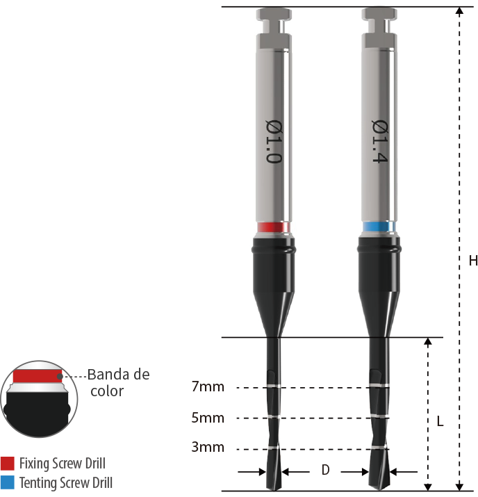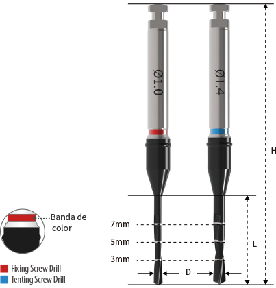 - La franja de color para distingir (rojo: Fixing Screw Driver, Azul: Tenting Screw Drill).