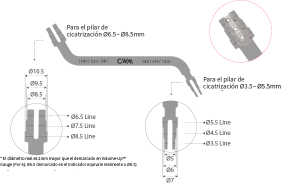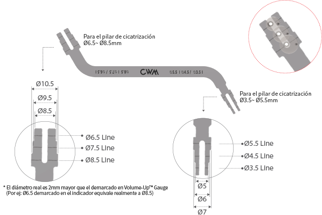 Posicionar el Volume-up™ Gauge en el sitio a implantar de acuerdo con la línea de diámetro marcada en Volume-up™ Gauge.