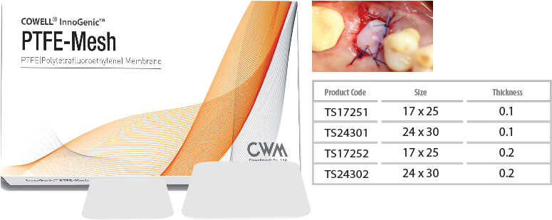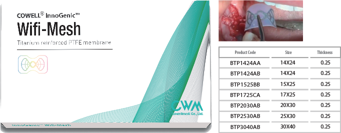 - InnoGenic™ Wifi-Mesh, PTFE-Mesh y Ti-Mesh son membranas no reabsorbibles para ser utilizadas en defectos intraorales, especialmente en exodoncias y sitios de injerto óseo. InnoGenic™ Wifi-Mesh y PTFE-Mesh están fabricadas en un 100% de PTFE, una membrana de politetrafluroetileno (teflón), que es un material biológicamente inactivo y compatible con los tejidos. InnoGenic™ Wifi-Mesh está reforzada con titanio (Titanium Gr II, ASTM F 67) incluído entre 2 capas de PTFE.
