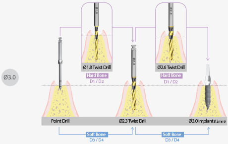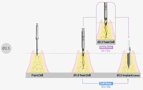 ※ 골질 D4 Bone에서는 Drilling 깊이를 조절하여 Implant가 Self Tapping하면서 식립될 수 있도록 한다.