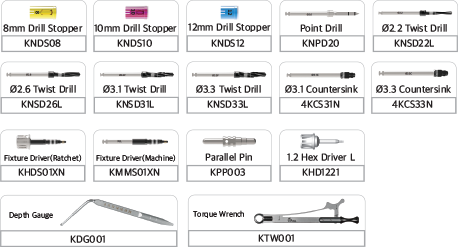 - 하나의 Drill 과 Stopper로 모든 임플란트 길이에 적용할 수 있는 간편한 구성의 1차 수술 kit