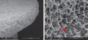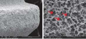 - 임플란트의 상단부에서 5,000배 확대된 전자현미경 사진에서 표면처리 양상을 관찰