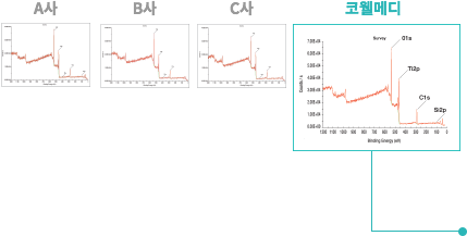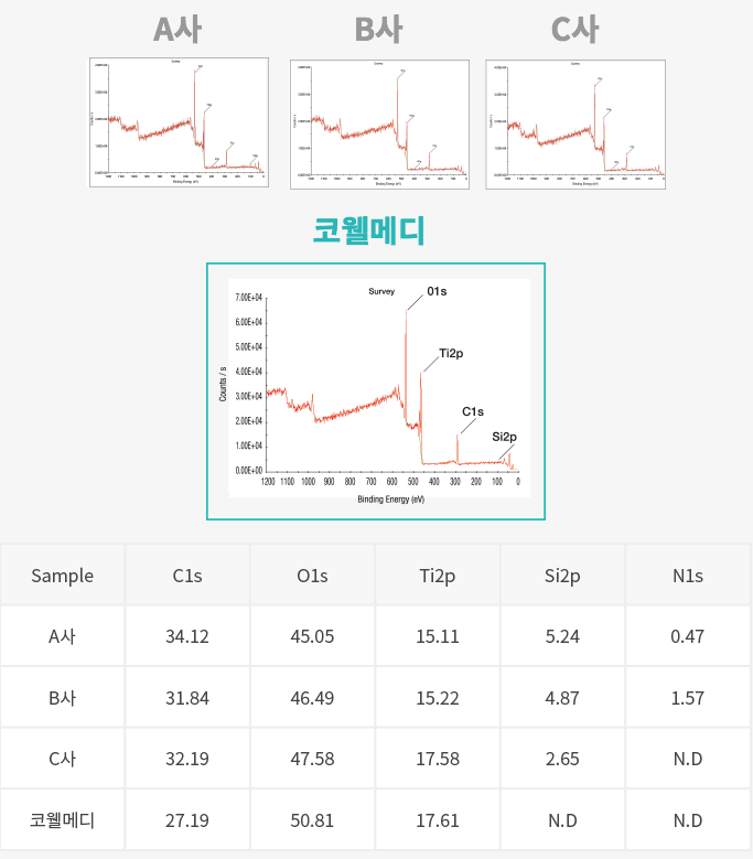 - 코웰메디 INNO SLA의 경우 탄소(C1s), 산소(O1s), 티타늄(Ti2p)의 성분으로만 구성되며 알칼리 세척수의 주원소인 수산화 나트륨(NaOH)이 규소(Si)와 결합하여 수용성 Na2SiO2(OH)2·4H2O염(물유리)을 형성하여 다른 성분을 제거함