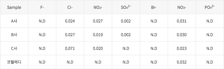 - 모든 제품에서 비슷한 성분의 이온이 검출되었으나 생체에 영향을 미치지 않는 성분과 정량이므로 인체에 안전한 것으로 나타남