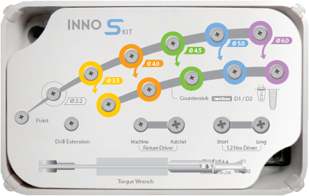 - 하나의 Drill 과 Stopper로 모든 임플란트 길이에 적용할 수 있는 간편한 구성의 1차 수술 kit