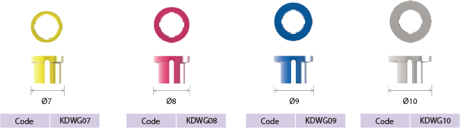 - 임플란트 크라운의 직경에 맞추어 7, 8, 9, 10mm Width Guide 선택 후 Buccal Guide에 장착하여 중심부에 드릴링 (Color로 크기를 구분)