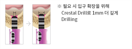 - Crestal Drill로 전단계 보다 1~2mm 깊게 Drilling