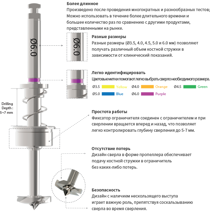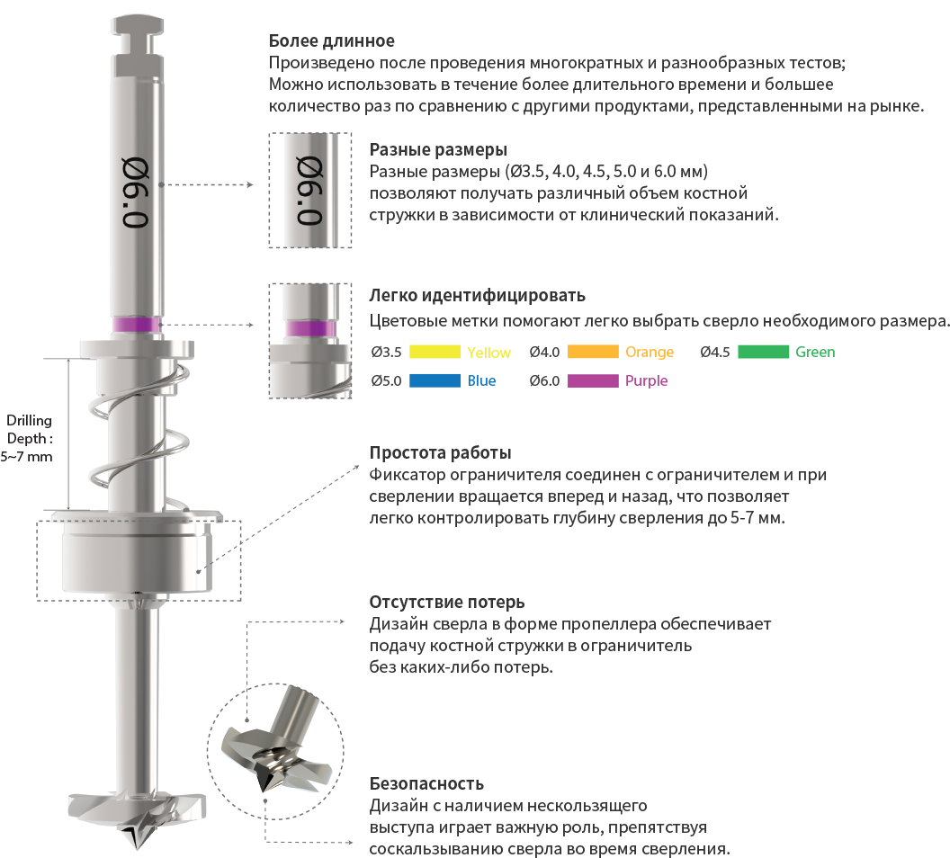 * 2 этап забора костной стружки: сверление на 7 мм рекомендуется выполнять после переноса костной стружки в емкость, поскольку при сверлении на 4 мм ограничитель и силиконовый экран полностью заполняются костной стружкой.