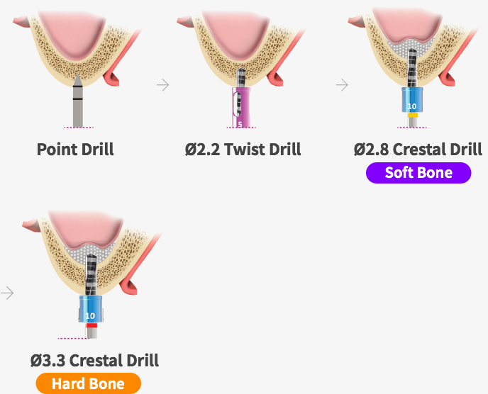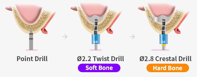 - ※ Use a drill that is one step shorter than the implant (Ex. 10mm implant, 8 ~ 9mm Drill)